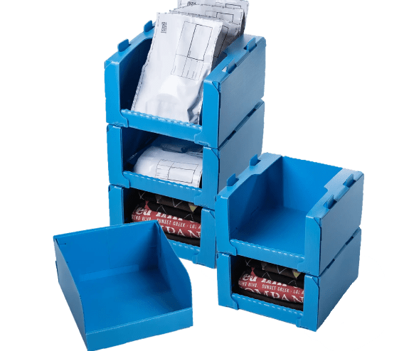 Una amplia gama de cajas y sobres reutilizables para comercio electrónico, contenedores de picking, gavetas de picking y estanterías modulares after estanterías.